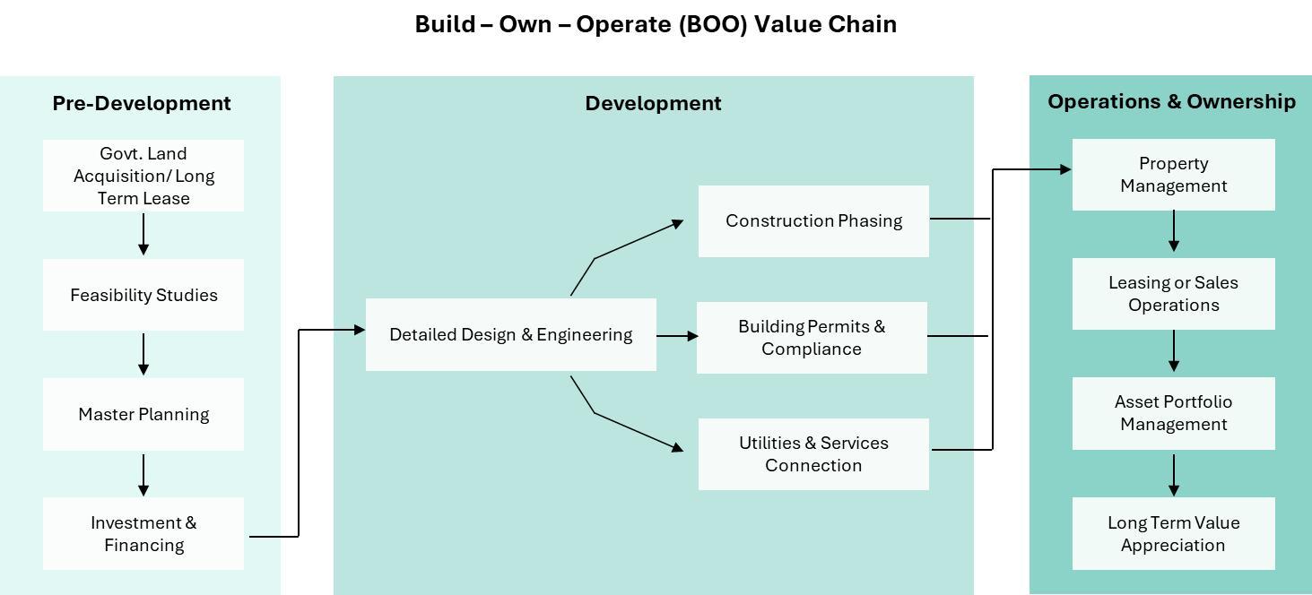 Whereas, in a Build-Own-Operate (BOO) Model, the private entity finances, builds, owns, and operates the project indefinitely, with regulatory oversight. This model is ideal for large, complex PPP infrastructure projects, particularly high-value ventures requiring specialized operational expertise.