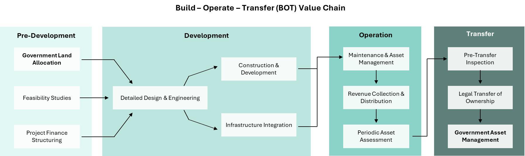In the Build-Operate-Transfer (BOT) Model, the private sector builds and operates the project for a set period before transferring ownership to the government. These projects are normally large-scale, greenfield infrastructure projects that would otherwise be financed, built, and operated solely by the government.
