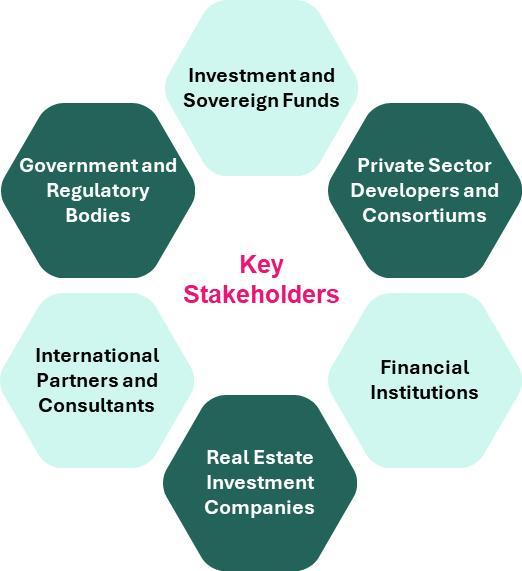 In essence, several stakeholders play a key role when defining the PPP framework. The Real Estate PPP ecosystem, particularly, encompasses a diverse range of entities, each playing a crucial role in shaping the sector’s growth and development. Private developers and consortiums contribute technical knowledge and financial backing, while financial institutions help structure investment models and mitigate risks. Real estate investment companies manage assets and optimize project returns, ensuring profitability for investors. International partners and consultants provide regulatory guidance, while government and regulatory bodies streamline approval processes and maintain legal oversight. The Public Investment Fund (PIF) also plays a critical role by financing large-scale projects and reducing investment risks, thereby encouraging foreign and domestic participation.