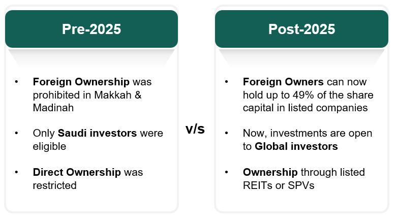 - Ownership Cap: Foreign investors can now hold up to 49% of the share capital in eligible listed companies and REITs with exposure to Makkah and Madinah.