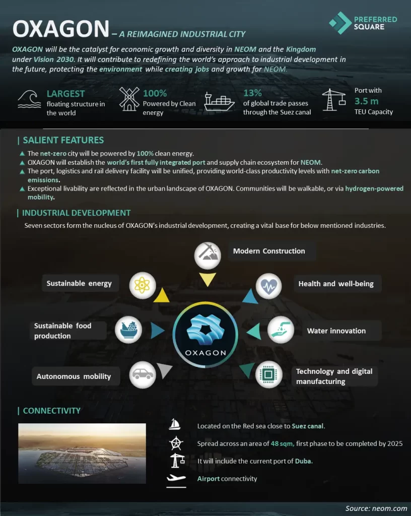 Under the NEOM project of Public Investment Fund (PIF), Oxagon with a 48 sqm development area, is strategically located in northwest Saudi Arabia, situated on the Red Sea near the Suez Canal. Approximately 13 per cent of global trade passes through the Red Sea, and it is positioned to be one of the world’s most technologically advanced logistics hubs with state-of-the-art integrated port and airport connectivity. Oxagon will be an industrial engine for NEOM.