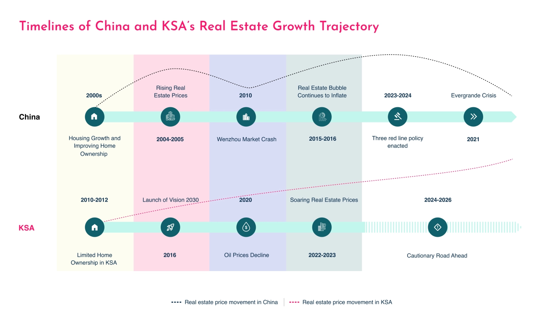This report identifies and examines the parallels and distinctions between the real estate industries of KSA and China. It also offers strategic recommendations for KSA to prevent a potential housing bubble, aligning with the ambitious goals of Vision 2030.